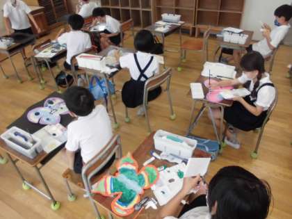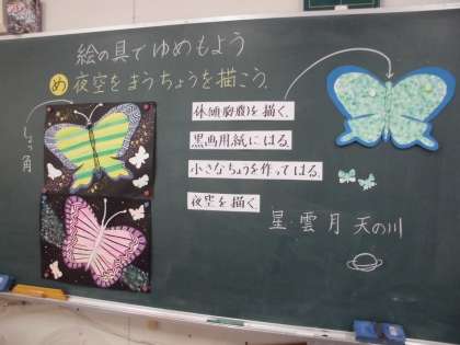 図工の学習では、先週の続きで「絵具でゆめもよう」〜夜空を舞うちょうを描こう〜の学習に取り組みました。一人一人が思い思いにきれいなちょうを描いています。