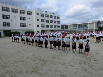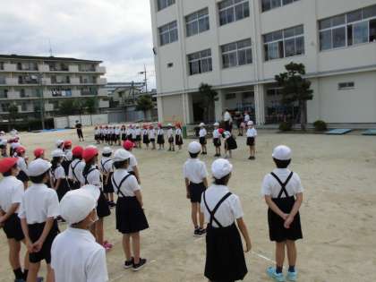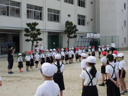 学校が再開されてから1か月。学校生活にも慣れてきた1年生が、お兄さん・お姉さんたちの前で、「よろしくお願いします。」と元気な声が運動場に響きました。