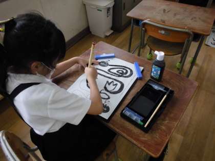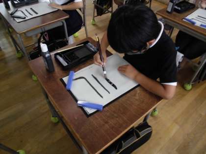 道具の名前の確認や準備や後片付けの仕方、筆の持ち方や姿勢など基本的なことを学習した後、直線や曲線のなぞり書きの練習をしました。さいごは「一」の文字を書きましたが、緊張しながらもとても上手に書くことができました。