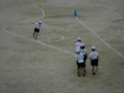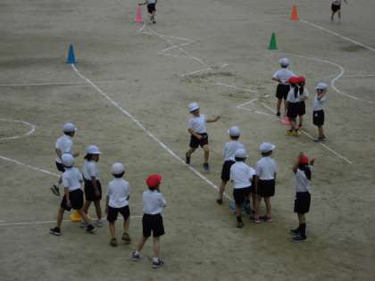廊下から運動場を見てみると、1年生の子どもたちが、運動場に石灰で描かれた長い直線やジグザク道などいろんなコースを走っていました。「がんばれー!」「やったー!」などいろんな声と楽しそうに活動している姿が見られました。