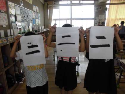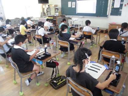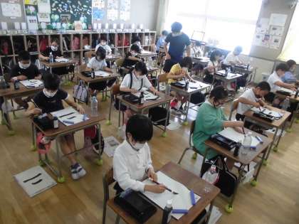 「横画の練習をしよう」ということで、書く時の姿勢、筆の持ち方、始筆・送筆・終筆などの筆の運び方などに気を付けて、学習に取り組みました。