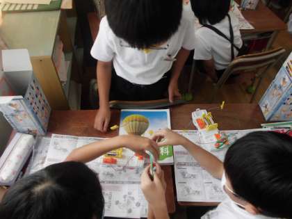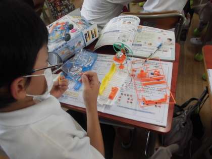 今日は、直列つなぎと並列つなぎの違いを学習するために、実験セットを組み立て、つなぎ方を変えて、プロペラの回り具合を見て、みんなで学習を深めました。
