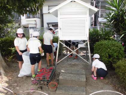 3年生は、校舎裏を担当しました。普段ほとんど子どもたちは立ち入らない場所ですが、大きめの落ち葉をたくさん拾い、すみずみまで頑張りました。