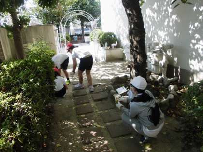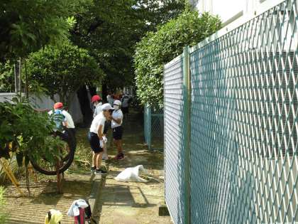 5年生は、主に校舎裏を担当しました。この場所は、草抜きより落ち葉がたくさんあり、落ち葉拾いが中心でした。ここも、普段はほとんど立ち入らない場所ですが、がんばってたくさんの落ち葉を拾いました。