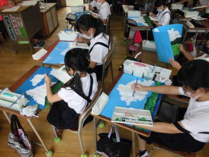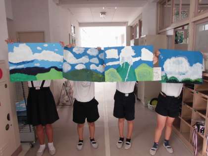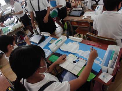 タブレットを使って自分のお気に入りの入道雲の写真を探し、それを題材にして絵を描きました。一人一人、とてもダイナミックで素敵な絵ができました。