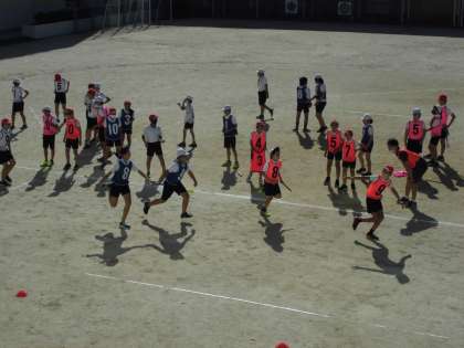 体育の学習でリレーに取り組みました。チームに分かれてバトンを渡す練習をしたり走る順番を決める話し合いをしたりして、最後はチーム対抗で競走をしました。