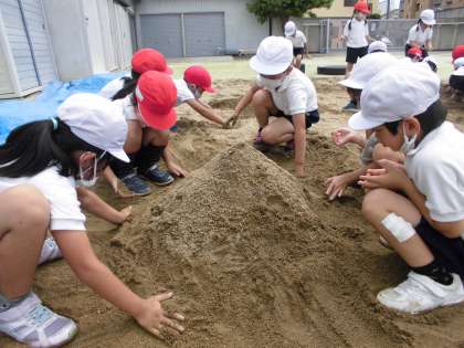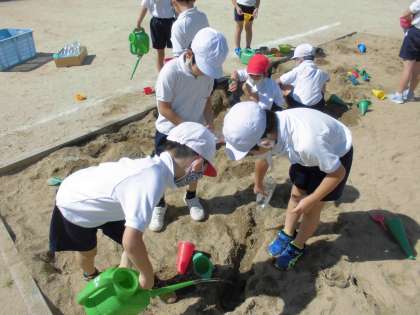 1年生は生活科の学習の一環で砂遊びをしました。普段はカバーがかけられてあって遊んだことのない砂場でしたが、生活科室からたくさんの道具を出して、山をつくったり池をつくったりみんなで楽しく活動することができました。