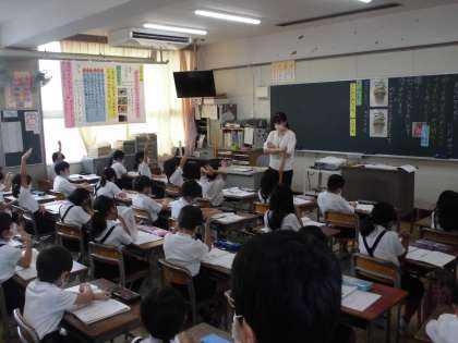 たくさんの先生方が見守る中での学習で、少し緊張した様子でしたが、担任の先生の話をしっかりと聞いて自分の考えを書いたり発表したりするなど、大変がんばっていました。