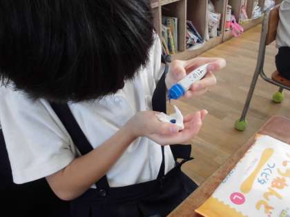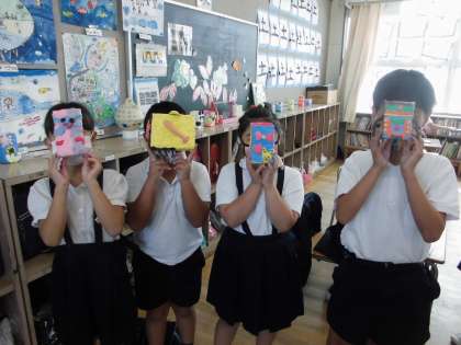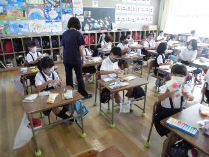 自分の好きな絵の具の色を紙粘土に混ぜて、カラフルな粘土をつくり、それをペットボトルや牛乳パックに張り付けていきました。