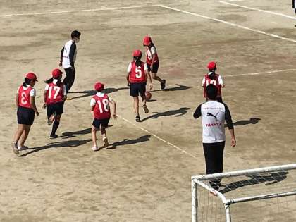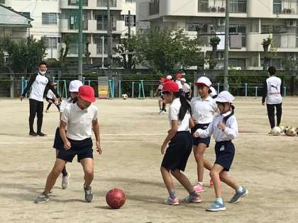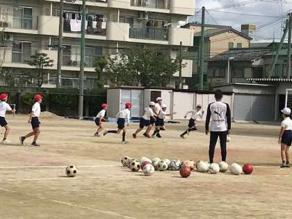 セレッソ大阪から3名のコーチが講師として来校されました。最初は鬼ごっこでウォーミングアップ、その後1対1の練習からゲーム、最後は対コーチとのゲームをしました。ずっと動いていた子どもたちは、それでも元気に楽しくプレーしていました。