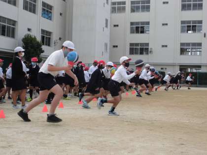 体育などで使うコーンとボールを使ってアイスクリームに見立てて、それを各班ごとにバトンのようにつないでいく、リレー競走です。