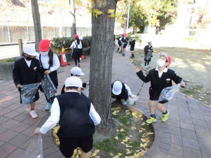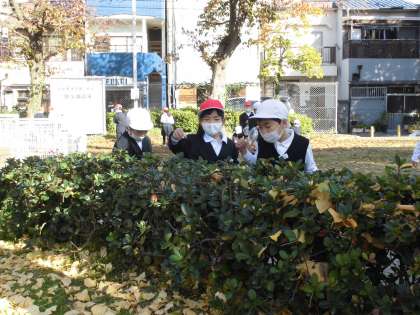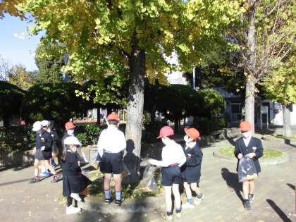 生活科の学習で近くの三角公園に落ち葉拾いをしに行きました。
