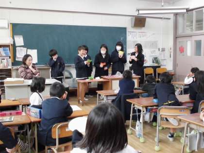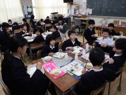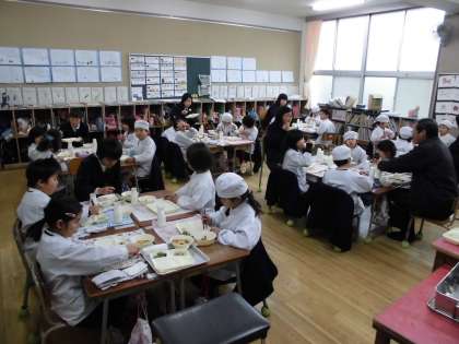 6年生が、1年生〜5年生の教室に分かれて給食を食べました。