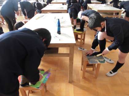 今日は、絵を描いて色付けをした板を、のこぎりを使ってギコギコと切っていきました。のこぎりの角度や力の入れ方など、なかなか思うように進まない場面もありましたが、粘り強く作業を進めていくうちに、自分なりのコツをつかんでいる子がたくさんいました。続きは、来年度に持ち越しです。