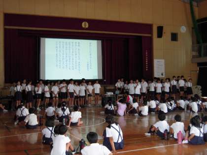 先生たちによる絵本の読み聞かせから始まり、6年生・5年生の語り・歌・演奏
