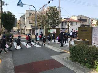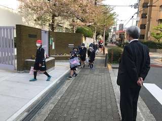 新しく1年生が登校班の仲間入りをし、新しい通学帽子をかぶっての登校です。