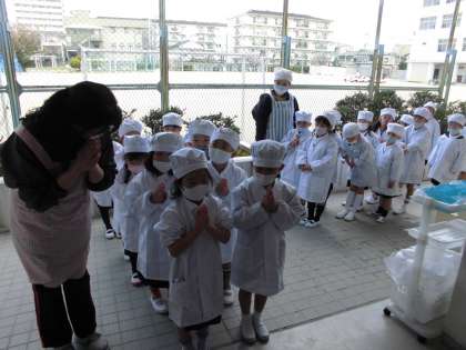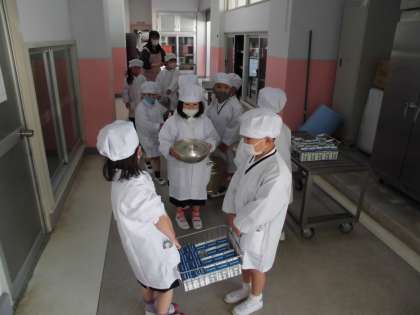 給食室の前で、「いただきます」のあいさつをした後、あいさつ自分の係りのおかずや食器などを調理員さんから渡してもらい、教室に戻っていきました。