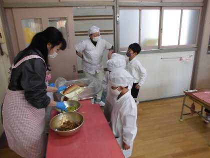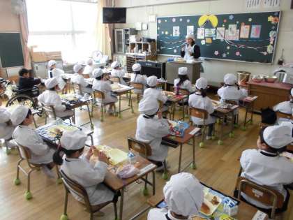 はじめて小学校の給食を目にした子どもたちは、とても嬉しそうでした。