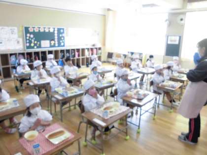 「いただきます」をして、笑顔で給食の時間が始まりました。