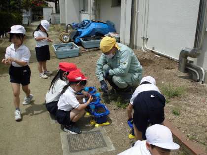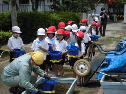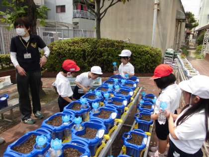 正門前に鉢を並べました。1組の子どもたちも2組の子どもたちも「早く咲かないかなー」ととても楽しみにしている様子でした。