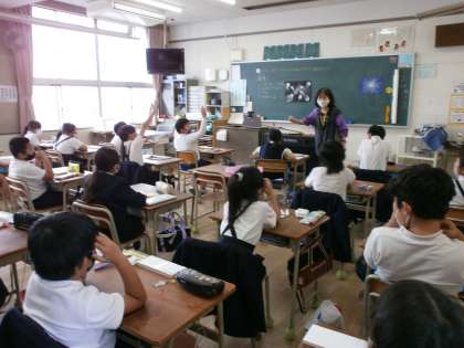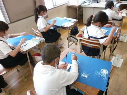 今までの図工の時間で学習してきた技法を使って、主に白色の絵の具を使っていろんな海月を描きました。