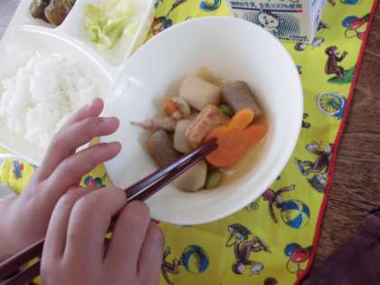 今日も調理員さんがラッキーニンジンを入れてくれていました。見つけると大喜び。大事に大事にして一番最後に、とてもおいしそうに食べていました。
