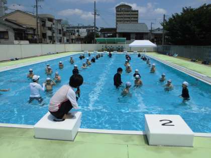 水慣れなどをした後は、早速、泳力テストを行いました。2年ぶりの水泳の学習でしたが、みんな頑張って泳いでいました。