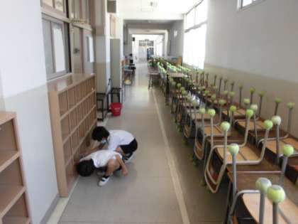 夏休み前の恒例になりましたが、学習机などを廊下に出しての大掃除です。