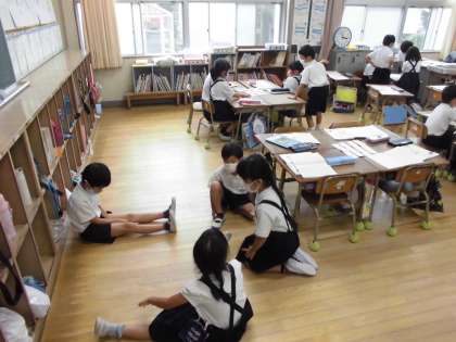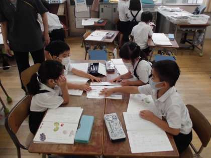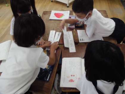 今日は、一人ひとりが作った言葉遊びを4人班の中であつめ、どの順番で読んだら面白いか話し合い、一つ一つの言葉遊びに動作をつけて読む練習をしました。