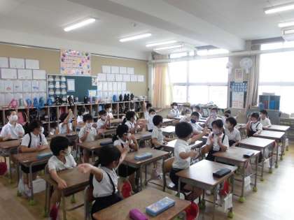マイクを通して集会委員会が学期を鳴らしたり物音を立てたりして、それが何かを充てるゲームです。難しい音もありましたが、正解すると子どもたちも大喜びでした。