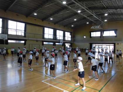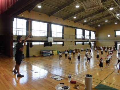 先生の話をしっかり聞いて先生の動きに合わせて、しっかりと練習をがんばっています。
