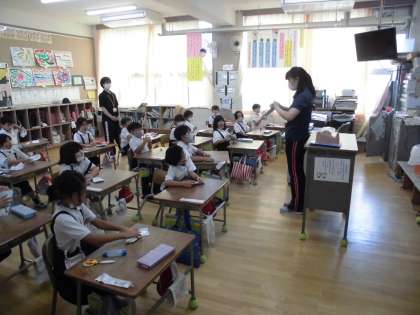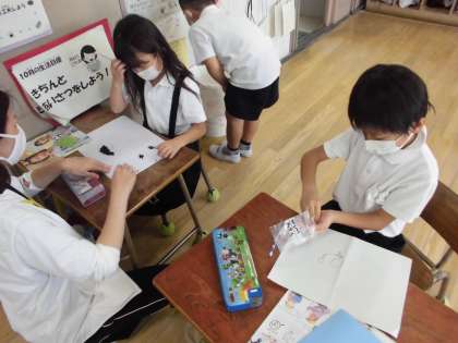 生活の時間で育てていたアサガオの種を収穫し、数を数えたり来年の新一年生に渡すプレゼントために封筒に入れたりしました。