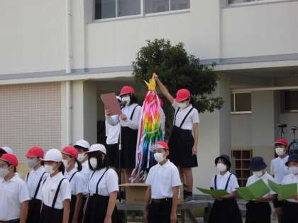 1年生から5年生の代表の子どもたちが一人一人6年生に向けて言葉を送りました。それに対して、6年生の子どもたちは、修学旅行でしっかりと学んできますと、力強い言葉を返してくれていました。そして、1年生から5年生までのみんなで作った折り鶴を6年生の子どもたちが千羽鶴いしてくれたものを披露してくれました。