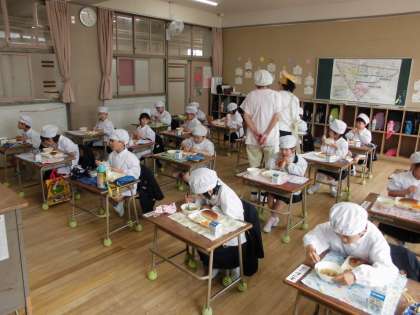 初めての給食、コロナ禍で黙食でありますが、子どもたちはとてもおいしそうに笑顔で食べていました。