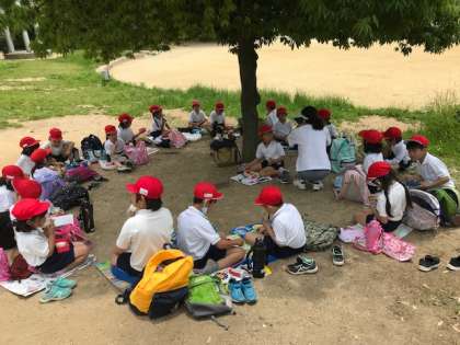 待ちに待ったお弁当タイムです。みんなで輪になって食べています。
