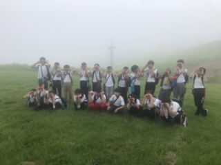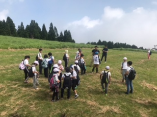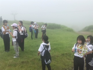 登りは、霧の中、登りました。神秘的な景観でした。先頭の子の後ろ姿も見えないほどの中での出発でしたが、頂上では霧も晴れ、素晴らしい景色を見ることができました。下山途中に水分補給をし、下りました。登山が初めてという子どもも多く、とてもいい経験をしました。