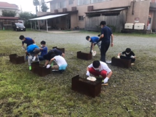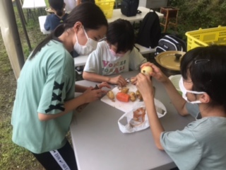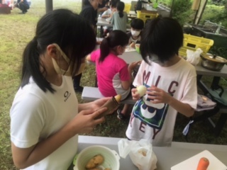 カレー作りが始まりました。包丁に慣れている子が、慣れていない子に教えたり、火を起こすのになかなか苦労したりしています。