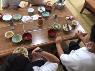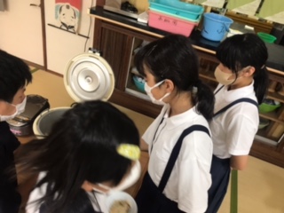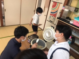 かやくご飯が人気で、子どもたちがどんどんおかわりに行ってます。この後、閉舎先。そして、バスに乗り込みます。