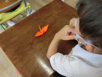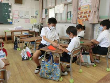 今日は、10月10日、11日と6年生が広島に修学旅行に行くことに合わせ、平和を祈念する折り鶴を作成する集会を開きました。6年生が中心となり、それぞれの縦割り班で、作り方を教え、みんなで千羽鶴を作ろうと計画しています。初めての子もいましたが、ていねいに教えてもらって折れるようになりました。また、もともと折り方を知っている子は、自分の分ができたら、ほかの子に折り方を説明し、力を合わせて作りました。