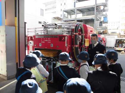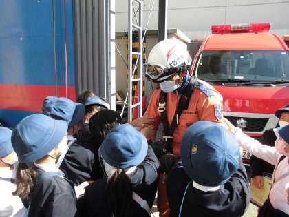 今日は、3年生が旭消防署に社会見学に行きました。消防車両を見せていただいたり、救助隊の道具を持たせていただいたりしました。隊員の方に消防活動の様子をお聞きし、子どもたちもたくさん質問をしました。最後に訓練を見せていただき、驚きと憧れの目で食い入るように見ていました。