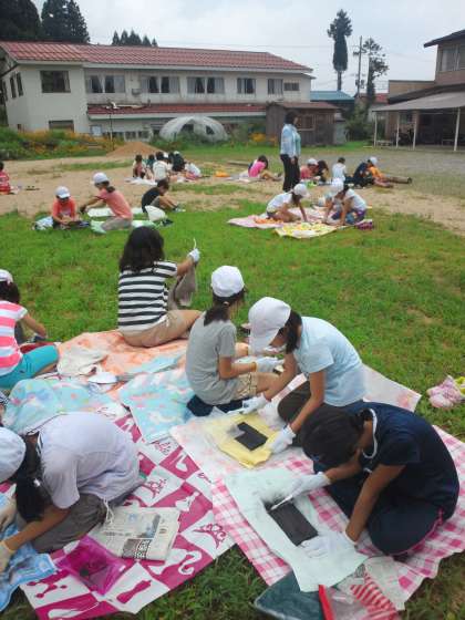みんなテントの下で無事作り上げました。持ち帰る作品をお楽しみに!