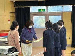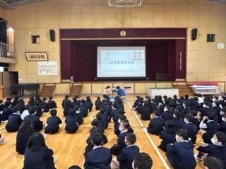 今日は、保健給食委員会の発表がありました。はじめに給食調理員さんへ日頃お世話になっていることを寄せ書きに書いてプレゼントをしました。次に給食クイズを行い、普段知らないことが出題されました。