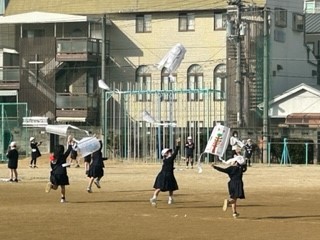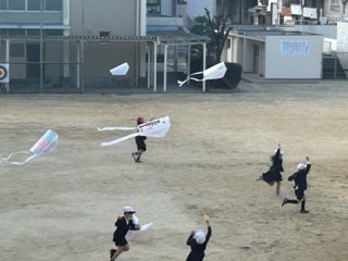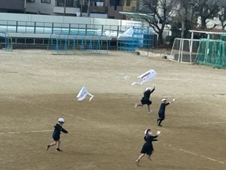 できた凧を空にあげました。寒いのも忘れ、少しでも高くあがあるよう、全力で走りました。みんな、「楽しい!!」と大喜びでした。