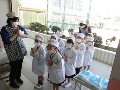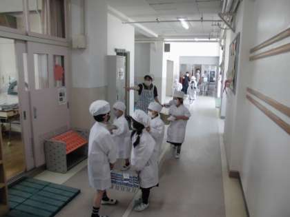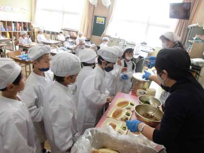 自分たちで用意をして、給食室から食器やおかずを運びます。