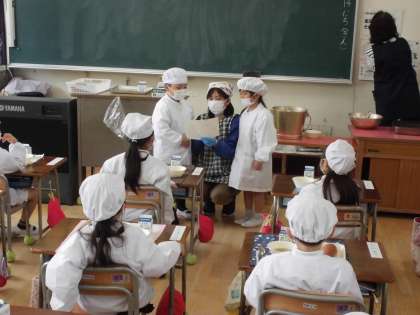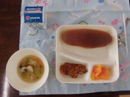 今日の給食は、黒糖パン、スープ、ジャガイモのミートグラタン、みかん(かんづめ)でした。