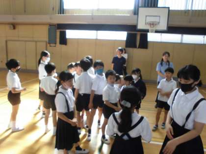 集会委員会が「誕生日の順番で」「靴下の長い順で」などとお題を出して、その順に並び変えます。班長が中心となってみんなで楽しく活動することができました。