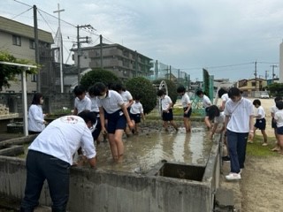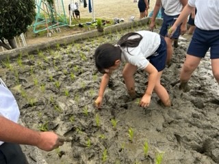 5年生が田植えを行いました。昼から天気が怪しかったのですが、なんとかもってくれました。はだしで入る田んぼに歓声があがりました。田んぼがある学校はめずらしく、自慢のたんぼです。もうすぐカブトエビも発生します。秋までさまざまな手入れをしていきます。