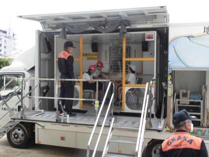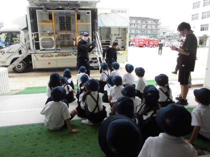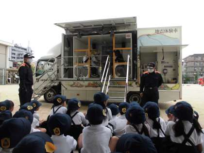 大阪市に数台しかない起震車に来ていただき、実際の地震の揺れを子どもたちは体験しました。震度6や7の揺れの中では何かにつかまっているのがやっとの揺れでした。実際に地震が起きた時にどのように行動するべきなのか、自分でしっかりと考える良い体験をすることができました。