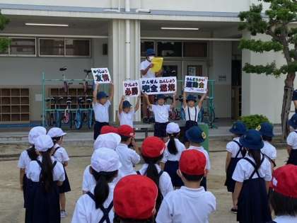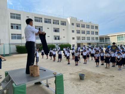 まず、校長先生から新しい標準服のズボンの紹介のお話がありました。この度、五分丈のズボンと長ズボンを業者に扱ってもらえることとなりました。これから秋を迎え、冬に近づくにつれ、寒い日も増えます。防寒や活動のしやすさ、またジェンダーフリーの観点から、男女とも、選ぶ選択肢が増えたことを全校児童に伝えました。