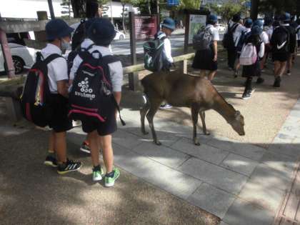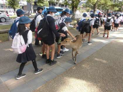 本日、5年生は奈良公園に遠足に行ってきました。奈良公園にはあらゆる所に鹿がいて、子どもたちはびっくりしていました。